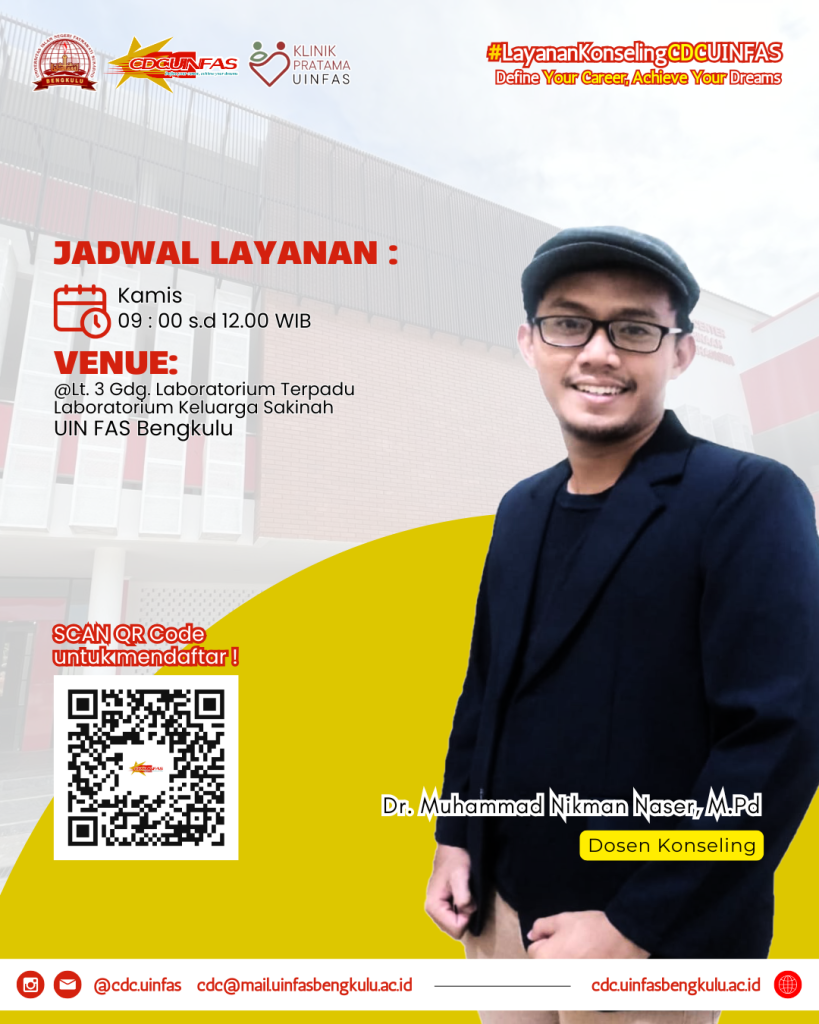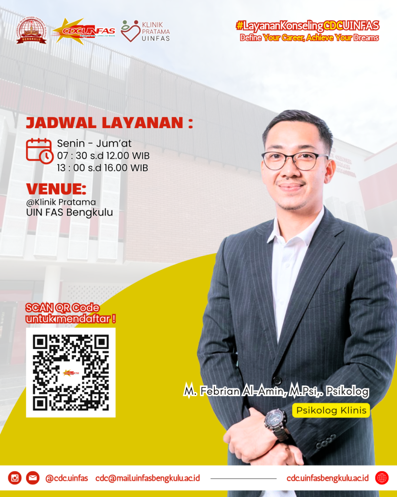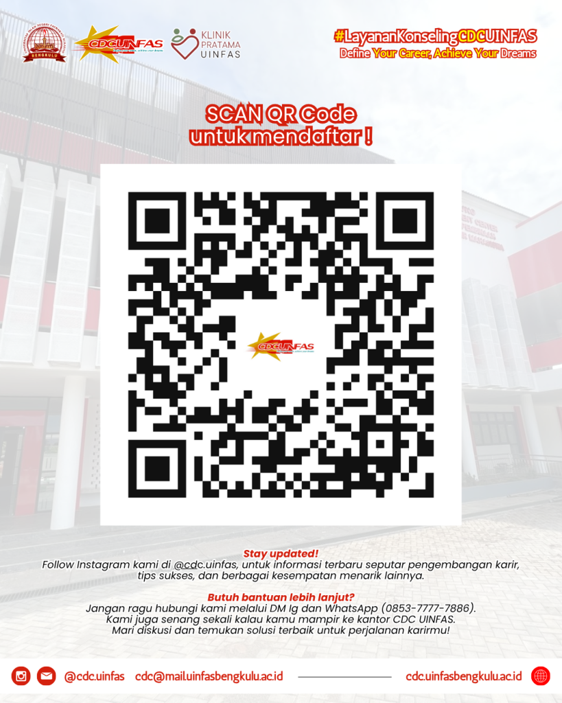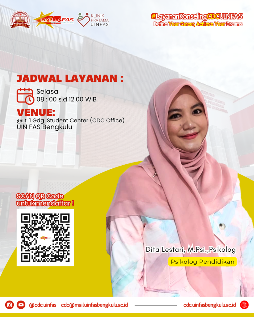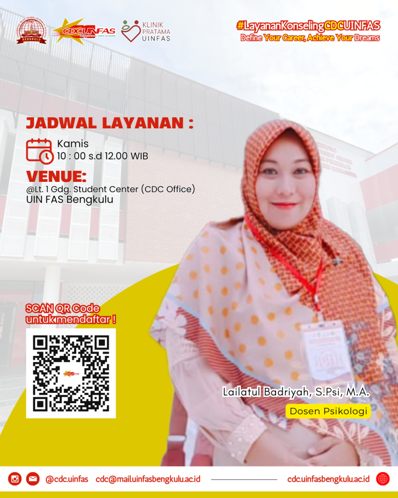 Layanan Konseling CDC UIN FAS bertujuan membantu mahasiswa menghadapi masalah akademik maupun nonakademik. Layanan ini dapat diakses secara gratis oleh seluruh civitas akademika UIN FAS Bengkulu. Sobat CDC akan didampingi oleh Psikolog atau Peer Counselor profesional. Registrasi melalui QR Code tertera pada flyer!